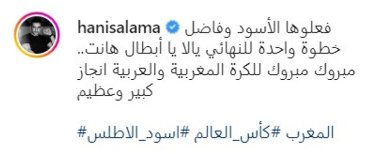 كما أشاد الفنان هاني سلامه بأسود الأطلس قائلا: "فعلوها الأسود وفاضل خطوة واحدة للنهائي.. يلا يا أبطال هانت.. مبروك مبروك للكرة المغربية والعربية.. إنجاز كبير وعظيم".