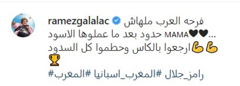 ونشر الفنان المصري رامز جلال، صورة للاعبي منتخب المغرب، وعلق عليها قائلا: "فرحة العرب ملهاش حدود، بعد ما عملوها الأسود، ارجعوا بالكاس وحطموا كل السدود".