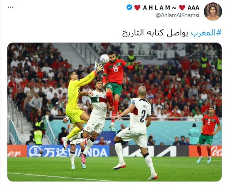 وأشادت الفنانة الإماراتية أحلام بأداء المنتخب المغربي، وقالت عبر حسابها على "تويتر": "المغرب يواصل كتابة التاريخ"، مضيفة: "ما شاء الله.. أول منتخب عربي يصل إلى نصف نهائي كأس العالم.. المنتخب المغربي.. فرحتنا اليوم عربية".
