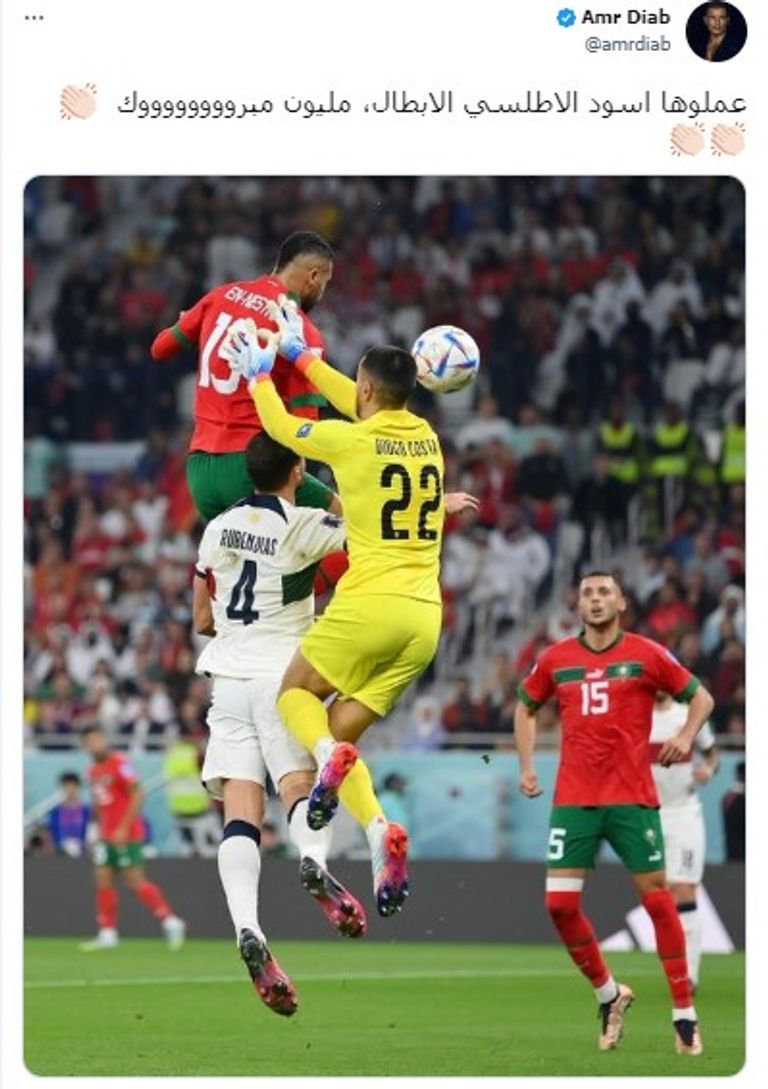 كما هنأ الفنان المصري عمرو دياب، منتخب المغرب بالفوز، قائلا في تعليق مقتضب عبر حسابه على "تويتر": "عملوها أسود الأطلس الأبطال.. مليون مبروك".