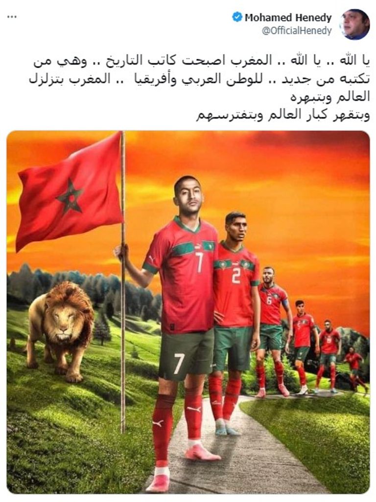 وعلق الفنان محمد هنيدي على أداء منتخب المغرب، قائلا عبر حسابه على موقع "تويتر": "يا الله.. يا الله.. المغرب أصبحت كاتب التاريخ.. وهي من تكتبه من جديد.. للوطن العربي وإفريقيا.. المغرب بتزلزل العالم وبتبهره، وبتقهر كبار العالم وبتفترسهم".