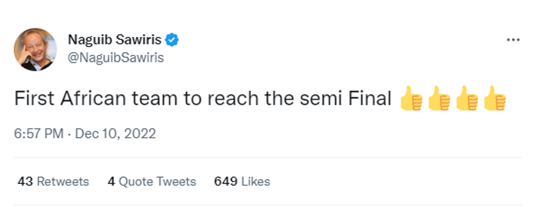 حيث قام الملياردير المصري نجيب ساويرس بالتغريد عبر حسابه في موقع التواصل الاجتماعي "تويتر"، قائلا: "أول فريق أفريقي يصل إلى نصف نهائي كأس العالم".