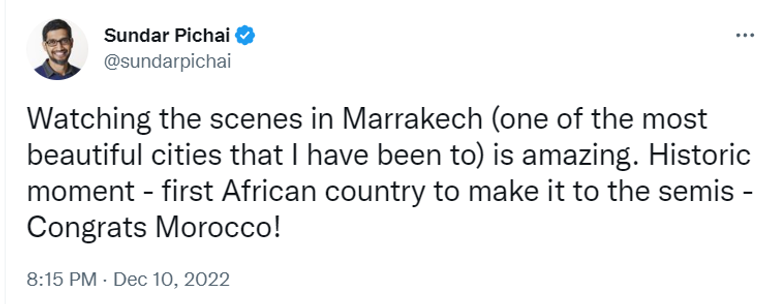 كذلك، علق سوندار بيتشاي الرئيس التنفيذي لشركة جوجل، على الاحتفالات المغربية والفوز الكبير لأسود الأطلس على البرتغال.