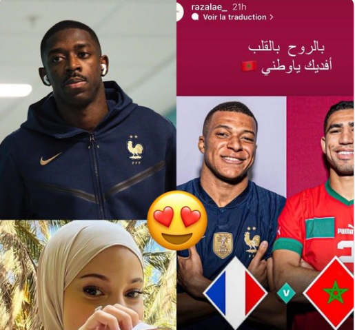 وقررت زوجة ديمبلي المغربية ريما إدبوش الانحياز لمنتخب بلدها المغرب الذي يُلاقي منتخب فرنسا فى مواجهة نصف نهائى كأس العالم "قطر2022 "، حيث نشرت صورة أكدت فيها أنها ستشجع منتخب بلادها المغرب.