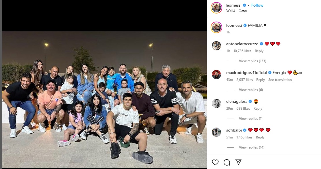 ونشر ميسي صورة عبر موقع "إنستجرام"، تجمعه مع عائلته بعد يوم من الفوز على كرواتيا، احتفالا بتأهل منتخب الأرجنتين إلى نهائي كأس العالم 2022.