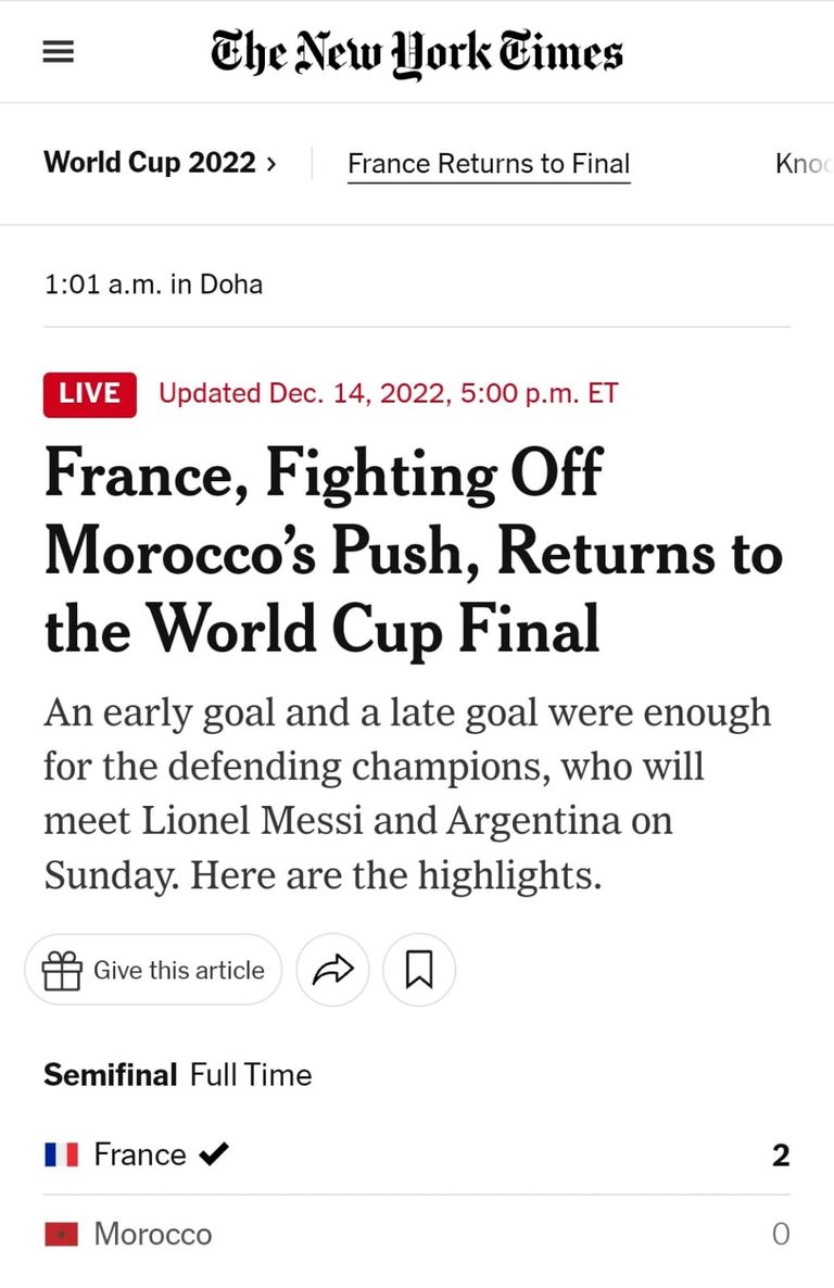 أما صحيفة "نيويورك تايمز" الأمريكية فقالت: "فرنسا تقاتل الاندفاع المغربي وتعود للنهائي مرة أخرى".