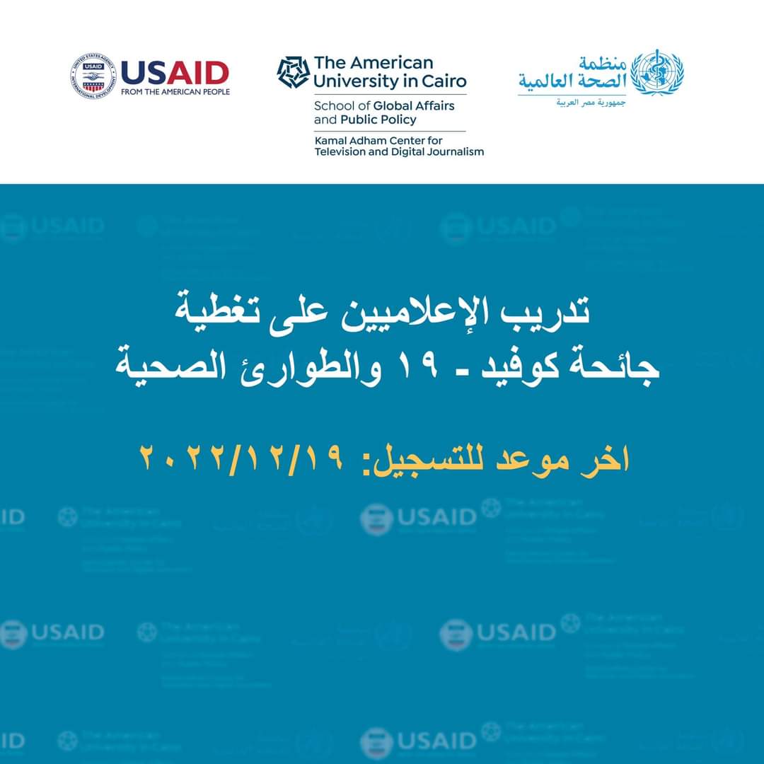 أعلن برنامج التنمية المهنية بمركز كمال أدهم للصحافة التليفزيونية والرقمية بالجامعة الأمريكية بالقاهرة وبالشراكة مع منظمة الصحة العالمية بمصر وبدعم من الوكالة الأمريكية للتنمية الدولية، الإعلان عن البرنامج التدريبي الممول والمجاني للإعلامين باللغة العربية على تغطية جائحة كوفيد-١٩ والطوارئ الصحية.