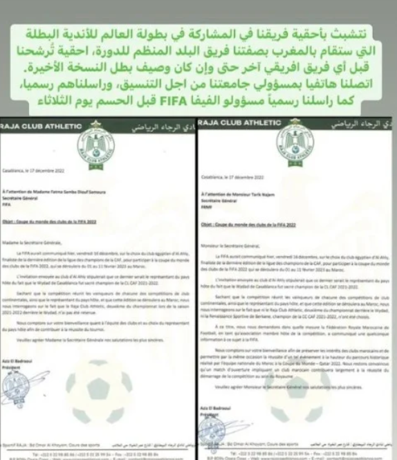 وأرفق رئيس نادي الرجاء المغربي في تدوينته على "انستجرام" صورة من الخطاب الرسمي المرسل من قبل النادي إلى الاتحاد الدولي لكرة القدم فيفا، للمطالبة بأحقية النادي في المشاركة ببطولة كأس العالم للأندية.