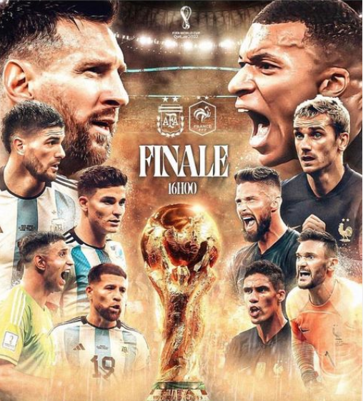 حيث حرص كريم بنزيما، نجم كرة القدم الفرنسية، على مؤازرة لاعبى منتخب بلاده في كأس العالم، على ملعب "لوسيل"، ونشر بنزيما "بوستر" يضم صورا مجسمة لنجوم منتخب بلاده ضد نجوم منتخب الأرجنتين، وعلق عليها: "حان الوقت، جميعا معا، انطلقوا".