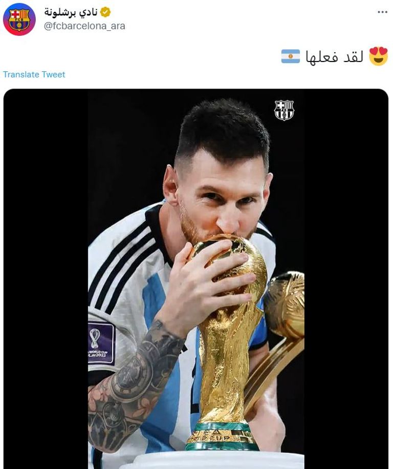 وتضمنت تغريدات برشلونة نشر صور لميسي وهو يحمل كأس العالم، وحملت إحداها تعليقا يقول "لقد فعلها"، كما كان الحساب الرسمي للنادي يحتفل بالأهداف التي سجلها في النهائي برموز تعبيرية تشير إلى أنه الأفضل في تاريخ كرة القدم.