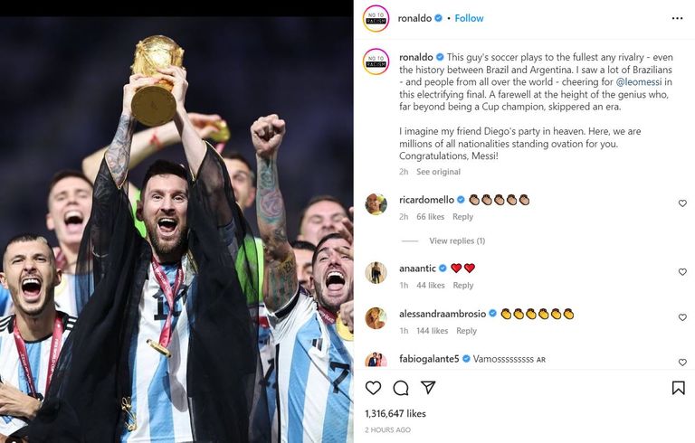 واستمرت رسائل التهنئة من نجوم البرازيل بعدما كتب الظاهرة رونالدو: "رأيت أشخاص برازيليين ومن جميع أنحاء العالم يهتفون إلى ميسي في هذا النهائي المثير، نهاية مستحقة لهذا العبقري، أتخيل حفلة صديقي دييجو في الجنة، تهانينا يا ميسي".