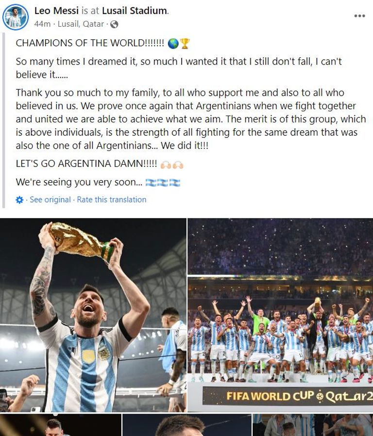 يذكر أن ليونيل ميسي أصبح بطل العالم في المحاولة الخامسة والأخيرة له، بعدما أعلن في وقت سابق أن مونديال قطر سيكون الظهور الأخير له بكأس العالم.