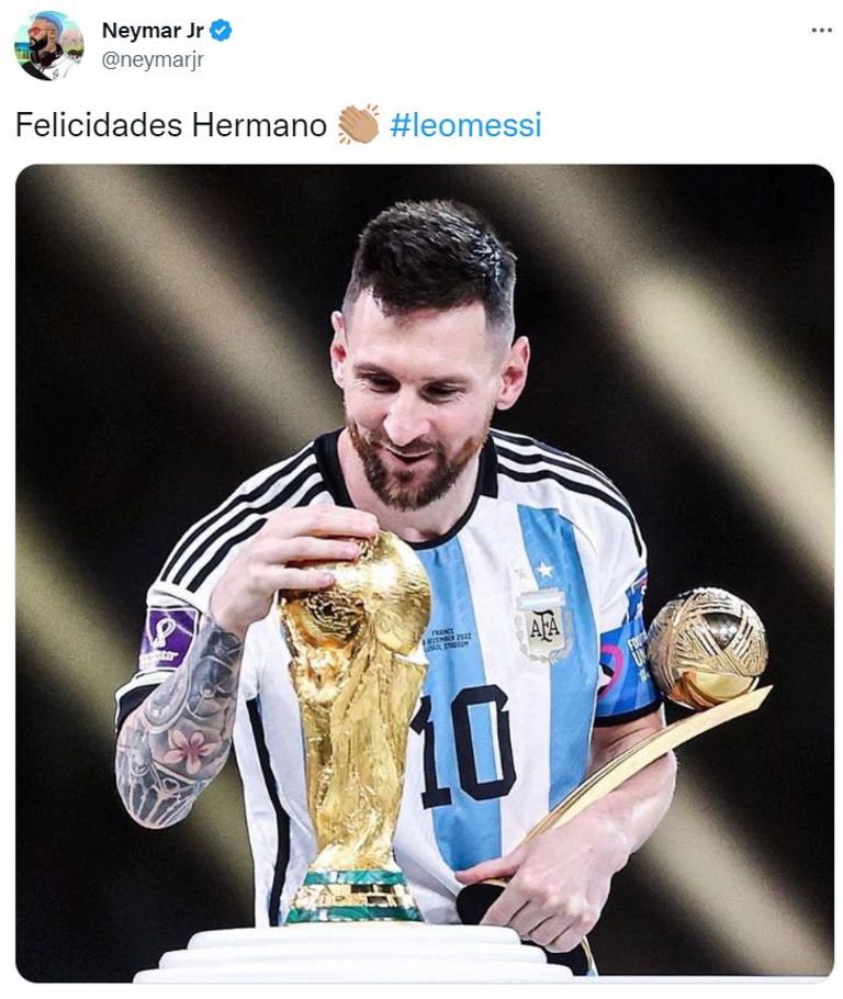 ونشر الهداف التاريخي لمنتخب البرازيل صورة لميسي وهو يحمل لقبي كأس العالم وجائزة أفضل لاعب، وكتب: "تهانينا أخي".