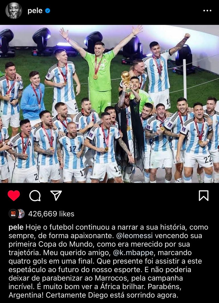 وقام الأسطور البرازيلية بيليه بنشر صورة لمنتخب الأرجنتين وهو يتُوج بكأس العالم، وكتب: "اليوم، تواصل كرة القدم سرد قصتها، كما هو الحال دائمًا، بطريقة آسرة".