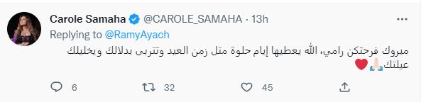 حيث هنأت النجمة كارول سماحة، النجم رامى عياش لقدوم مولودته الجديدة، وكتبت كارول قائلة: "مبروك فرحتكن رامي، الله يعطيها أيام حلوة مثل زمن العيد وتتربى بدلالك ويخليلك عيلتك".
