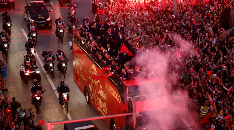 واصطفت الجماهير المغربية على طول الطرق والشوارع في العاصمة الرباط، حيث أشعلوا الألعاب النارية ولوحوا بالأعلام، تحية للاعبين الذين استقلوا حافلة مكشوفة وهم يرتدون البذات الرسمية ورابطات العنق تحت حراسة أمنية مشددة.