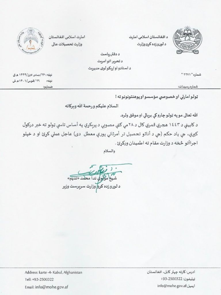 وبحسب رسالة وجهتها وزارة التعليم العالي في أفغانستان، موقعة من الوزير ندا محمد نديم إلى جميع الجامعات الحكومية والخاصة، قال الوزير: "أبلغكم جميعًا بتنفيذ الأمر المذكور بوقف تعليم الإناث حتى إشعار آخر".