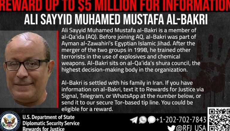 كشف الولايات المتحدة عن مكافأة قدرها 5 ملايين دولار لمن يدلي بمعلومات تساعد في اعتقال القيادي في تنظيم القاعدة،