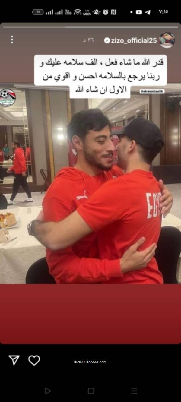 حيث دعم أحمد سيد "زيزو" لاعب الزمالك زميله في الملاعب أكرم توفيق ونشر زيزو صورة تجمعه بأكرم توفيق عبر "أستورى إنستجرام" معلقًا عليها:" قدر الله وما شاء فعل ألف سلامة عليك وربنا يرجعك بالسلامة أحسن وأقوى من الأول إن شاء الله".