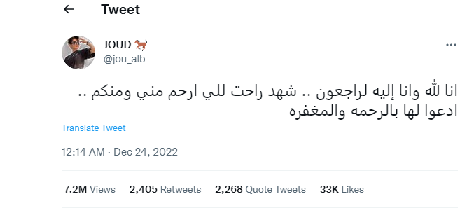 وقالت جود العنزي في تغريدة لها عبر "تويتر": "إنا لله وانا إليه لراجعون.. شهد راحت للي ارحم مني ومنكم.. ادعوا لها بالرحمه والمغفرة".