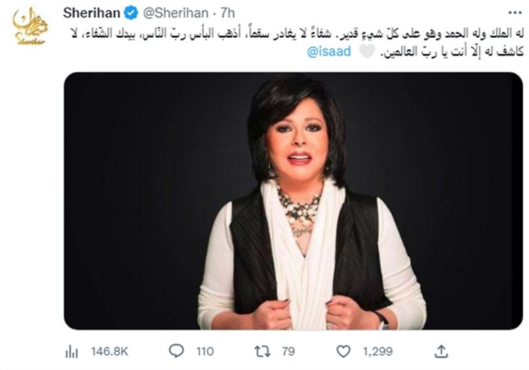 حيث كتبت شريهان: "له الملك وله الحمد وهو على كلّ شيءٍ قدير. شفاءً لا يغادر سقمًا، أذهب البأس ربّ النّاس، بيدك الشّفاء، لا كاشف له إلّا أنت يا ربّ العالمين".