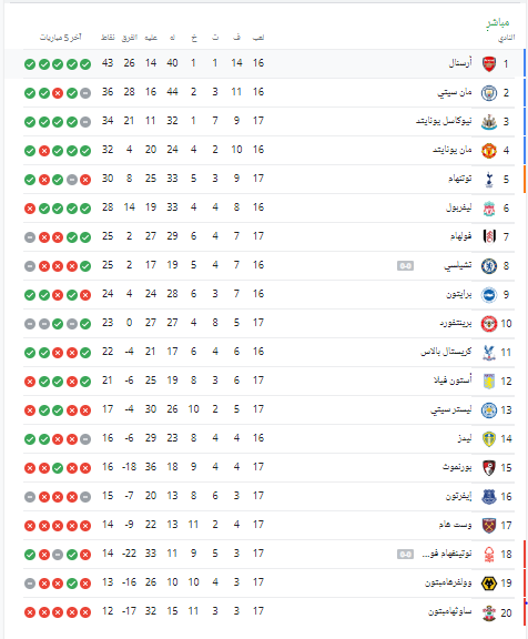 ويتصدر أرسنال جدول ترتيب الدوري الإنجليزي، برصيد 43 نقطة من 16 مباراة، ويتقدم بـ7 نقاط عن مانشستر سيتي الثاني الذي حصد 36 نقطة من 16 مباراة.
