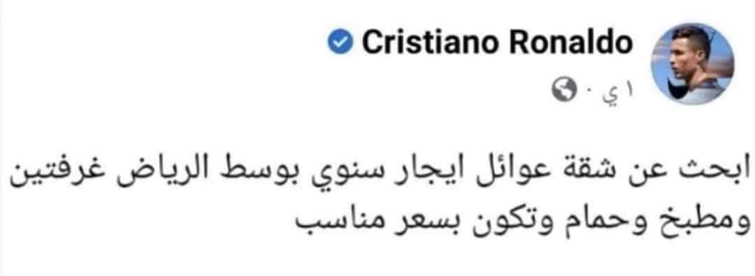 كما نشر أحد رواد "فيسبوك"، تغريدة مزيفة لرونالدو وهو يبحث عن مكان للإقامة في السعودية، كتب فيها: "ابحث عن شقة عوائل إيجار سنوي، بوسط الرياض، غرفتين ومطبخ وحمام وتكون بسعر مناسب".