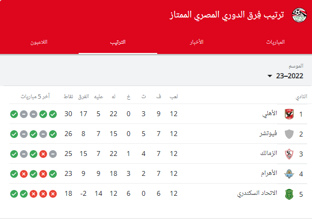 تزايد البحث حول ترتيب الدورى المصرى خلال الساعات الماضية، بعدما واصل الأهلى تصدره لجدول ترتيب الدورى المصرى بعد مباريات السبت برصيد 30 نقطة، بينما ارتقى فيوتشر إلى الوصافة برصيد 26 نقطة، بعد الفوز الذى حققه اليوم على سيراميكا وحل الزمالك ثالثًا برصيد 25 نقطة بينما جاء بيراميدز في المركز الرابع برصيد 23 نقطة.