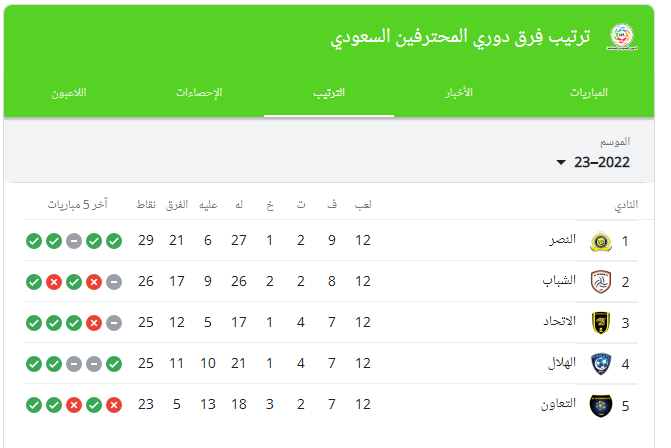 وفى المقابل، يحتل فريق الشباب وصافة جدول ترتيب الدوري السعودي برصيد 25 نقطة بفارق 4 نقاط عن فريق النصر الذى ينفرد بالصدارة برصيد 29 نقطة من 12 مباراة.