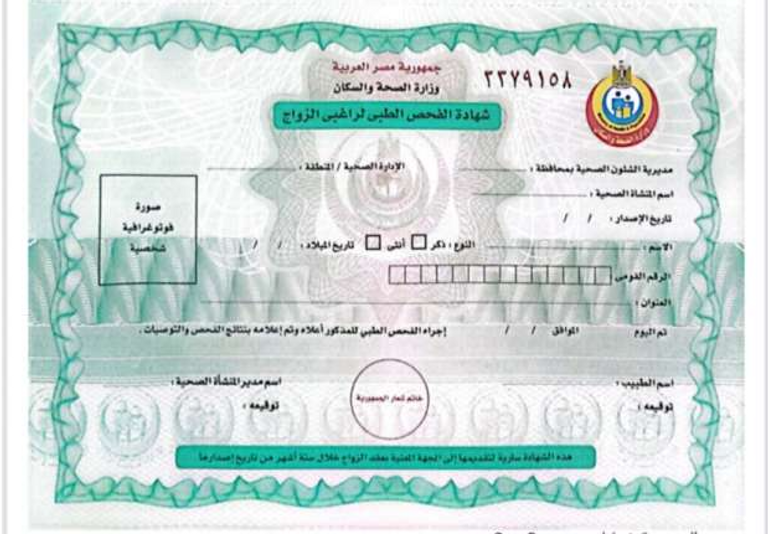 وإليك صورة لشهادة الفحص الطبي للمقبلين على الزواج في مصر، والتي تكون سارية لمدة 6 أشهر من تاريخ صلاحية استخراجها، والتي توضح البيانات المطلوبة لإتمام الإجراء، وفقا لصحيفة "الوطن" بمصر.