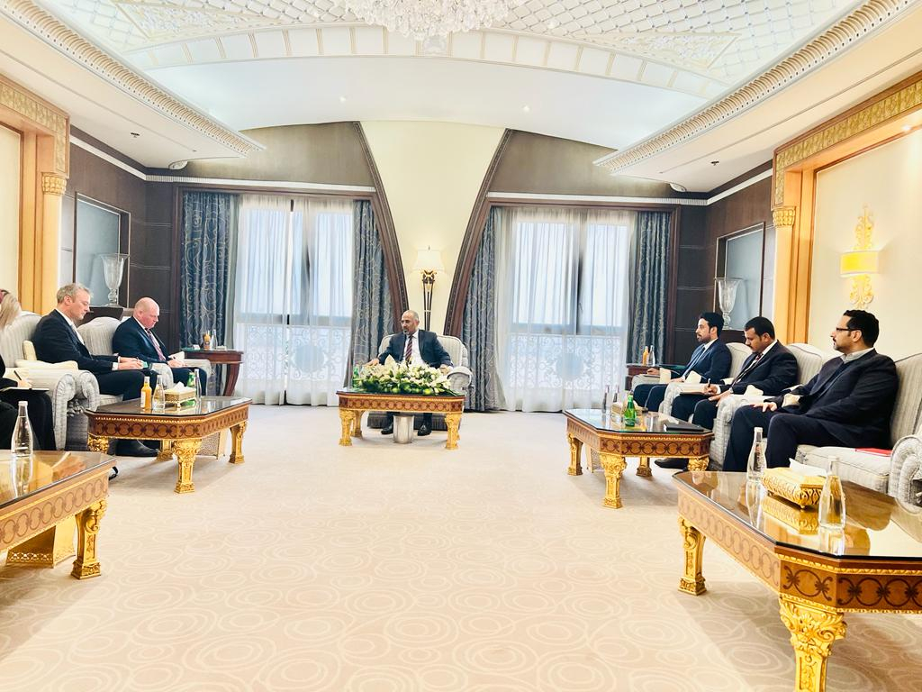 وناقش اللقاء تطورات الأوضاع السياسية، والعسكرية، والإنسانية في اليمن والجهود التي يبذلها مبعوث الأمين العام للأمم المتحدة، والمبعوث الأمريكي والدول العشر الراعية للسلام في اليمن.