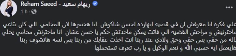 وعلقت ريهام سعيد، عبر صفحتها بموقع فيسبوك، على تأجيل الحكم في القضية، بالقول: "على فكرة أنا معرفش إن في قضية النهاردة لحسن شاكوش، أنا هخسرها لأن المحامي اللي كان بتاعي ماخترنيش ومراحش القضية اللي فاتت".