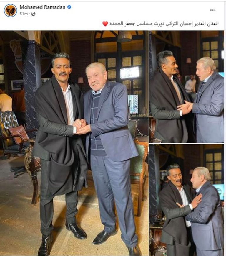 حيث نشر محمد رمضان عدة صور مع إحسان الترك عبر حسابه على "فيسبوك" خلال كواليس العمل، وعلق قائلا: "الفنان القدير إحسان الترك نورت مسلسل جعفر العمدة".