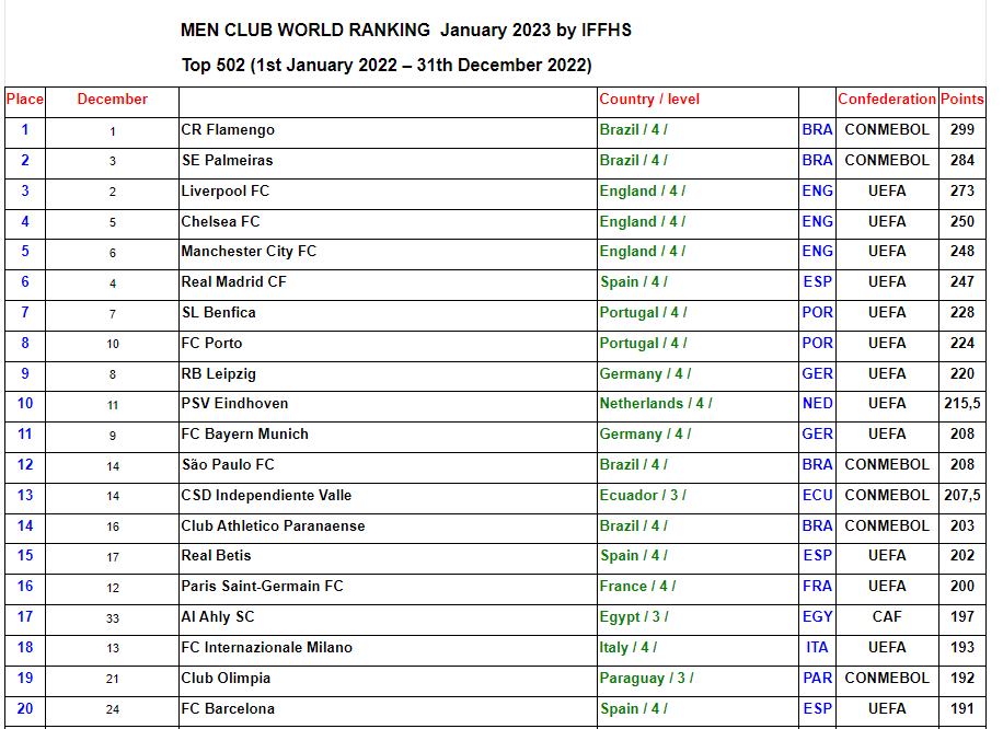 وجاء في المرتبة الثانية فلامنجو البرازيلي، ثم حل ليفربول الإنجليزي في المرتبة الثالثة، واحتل تشيلسي الإنجليزي المركز الرابع برصيد 291 نقطة.