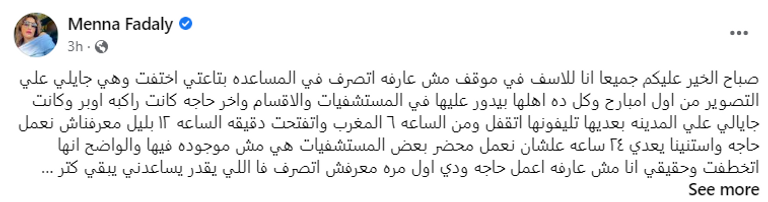 وعبر حسابها الرسمي على "فيسبوك" كتبت منة فضالي: "صباح الخير عليكم جميعا أنا للأسف في موقف مش عارفة اتصرف فيه المساعدة بتاعتي اختفت وهي جايلي على التصوير من أول امبارح وكل ده أهلها بيدور عليها في المستشفيات والأقسام وآخر حاجة كانت راكبة عربية (أوبر)، وكانت جايه على المدينة بعديها تليفونها اتقفل من الساعة 6 المغرب".