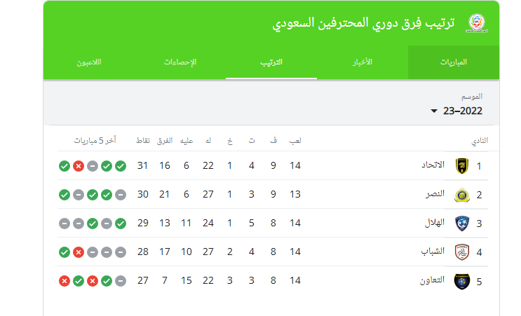 ترتيب فرق دوري "روشن" السعودي للمحترفين لكرة القدم قبل مبارة النصر ضد الاتفاق