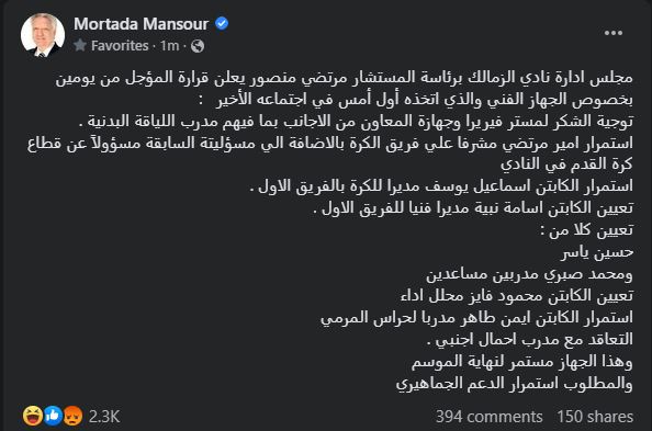 أعلن مجلس إدارة نادي الزمالك المصري، برئاسة مرتضى منصور، عن قراره المؤجل منذ يومين بخصوص الجهاز الفني للفريق الأول لكرة القدم بالنادي.