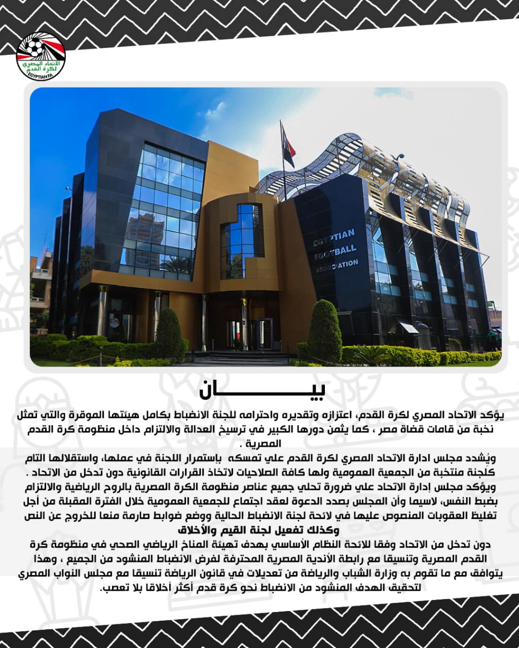 أصدر الاتحاد المصري لكرة القدم، بيانا رسميا، رفض فيه اعتذار لجنة الانضباط، وذلك بعد أن تقدمت اللجنة باعتذار عن استكمال مهام عملها.
