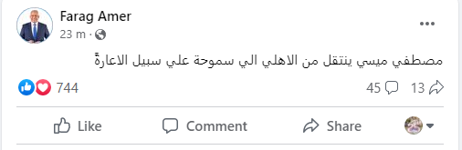 وكتب فرج عامر عبر حسابه الرسمي على موقع التواصل الاجتماعي "فيسبوك": "مصطفى ميسي ينتقل من الأهلي إلى سموحة على سبيل الإعارة".