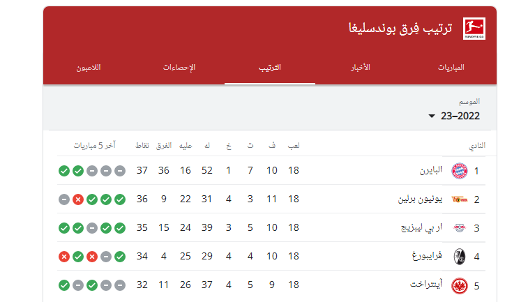ويتصدر بايرن جدول الترتيب برصيد 37 نقطة من 10 انتصارات و7 انتصارات وخسارة وحيدة، فيما يأتي يونيون برلين في المركز الثاني بـ36 نقطة.