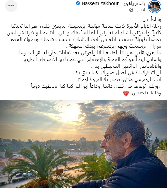 ونشر باسم ياخور صورة لوالده عبر حسابه على "فيسبوك"، معلقا عليها: "وداعًا أبي، رحلة الأيام الأخيرة كانت صعبة مؤلمة ومحبطة مايعزي قلبي هو اننا تحدثنا كثيرًا واخبرتني اشياء لم تخبرني اياها ابدًا عنك وعني".