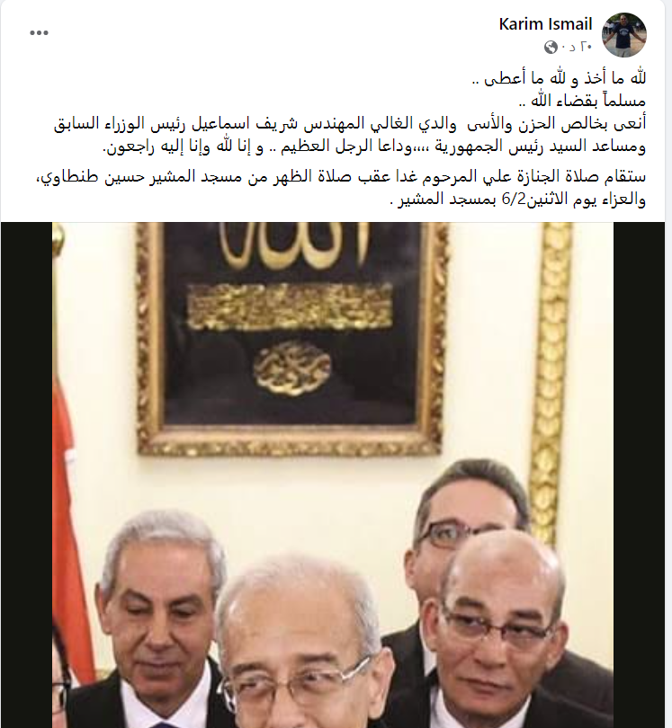 وقال نجله خلال صفحته على موقع التواصل الاجتماعي، “فيسبوك”: لله ما أخذ ولله ما أعطى، مسلمًا بقضاء الله، أنعى بخالص الحزن والأسى والدي الغالي المهندس شريف اسماعيل رئيس الوزراء السابق ومساعد السيد رئيس الجمهورية، وداعا الرجل العظيم وإنا لله وإنا إليه راجعون، ستقام صلاة الجنازة على المرحوم غدا عقب صلاة الظهر من مسجد المشير حسين طنطاوي، والعزاء يوم الاثنين 6/2 بمسجد المشير.