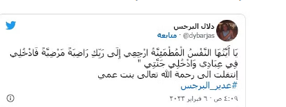 جاء ذلك وفق ما أعلنته ابنة عمها دلال البرجس عبر حسابها في توتير، حيث شاركت منشورا قالت فيه: "يَا أَيَّتُهَا النَّفْسُ الْمُطْمَئِنَّةُ ارْجِعِي إِلَى رَبِّكِ رَاضِيَةً مَرْضِيَّةً فَادْخُلِي فِي عِبَادِي وَادْخُلِي جَنَّتِي".. انتقلت إلى رحمة الله تعالى بنت عمي غدير البرجس".