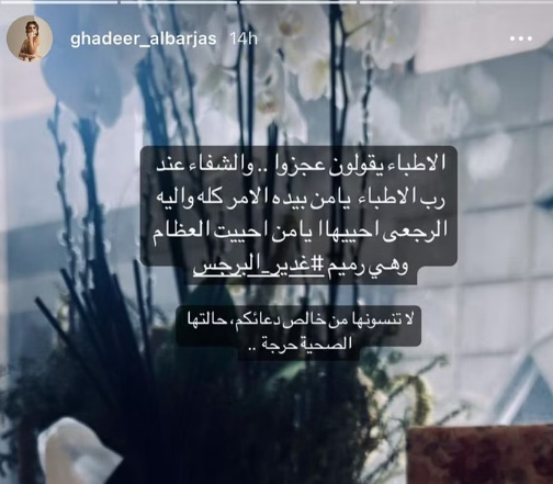 وفي شهر يناير الماضي، كانت الفاشنيستا الكويتية دانا الطويرش قد شاركت بحملة دعاء لشفاء غدير البرجس عبر حسابها في توتير، وقالت بمنشور آنذاك: "يارب شفاءك لمن يُعاني من الألم ولُطفك في تِلك الأجساد المُتعبة. اللهُم اشف كل مريض"، الأمر الذي يشير إلى أن حالة غدير الصحية بدأت في التدهور منذ بداية العام الجاري.
