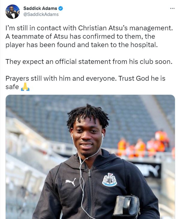 حيث قال الصحفي الغاني الموثوق صديق أدامز، على صفحته عبر "تويتر": "ما زلت على اتصال بالمقربين من كريستيان أتسو، أكد لنا زميل في فريقه، أنه تم العثور على اللاعب ونقله إلى المستشفى".