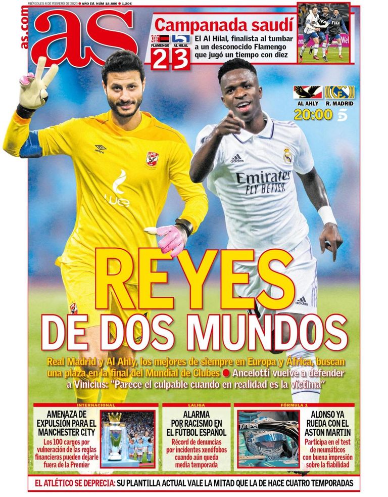 أما صحيفة "آس" الإسبانية، فقد وضعت صورة محمد الشناوي، حارس مرمى الأهلي، وهو يشير بعلامة النصر، إلى جوار البرازيلي فينسيوس جونيور جناح ريال مدريد وهو يحتفل بأحد أهدافه.