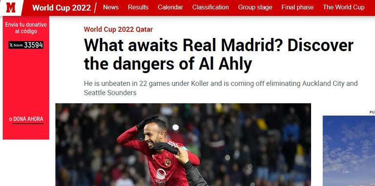 ووضعت الصحيفة على غلافها الرئيسي للعدد صورة لشعار ريال مدريد، التاج الملكي وتحته صورة لكوكب الأرض، في إشارة للمباراة المرتقبة ضد الأهلي المصري.