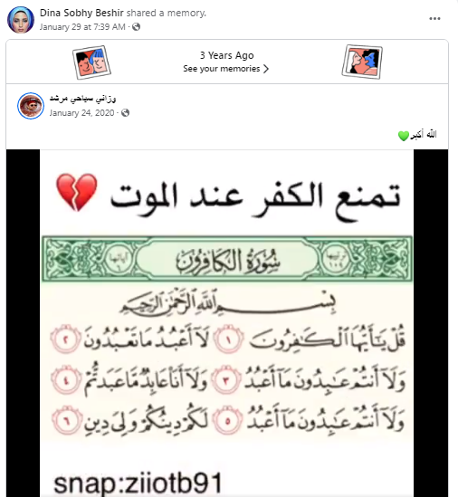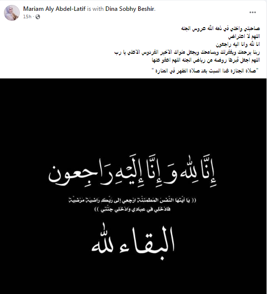 وكان آخر ما كتبته دينا عبر حسابها على موقع التواصل الاجتماعي "فيسبوك" هو مشاركة لمقطع فيديو يتضمن آيات وسور من القرآن الكريم.