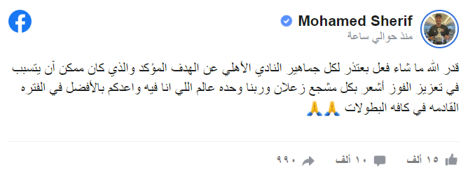 وقال محمد شريف: "قدر الله ما شاء فعل بعتذر لكل جماهير النادي الأهلي عن الهدف المؤكد والذي كان ممكن أن يتسبب في تعزيز الفوز أشعر بكل مشجع زعلان وربنا وحده عالم اللي أنا فيه وأعدكم بالأفضل في الفترة القادمة في كافه البطولات".