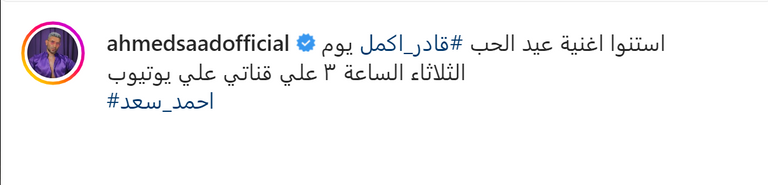 كما نشر أحمد سعد بوستر أغنيته الجديدة، عبر حسابه الرسمي على موقع "إنستجرام"، وعلق عليها قائلا: "استنوا أغنية عيد الحب قادر أكمل يوم الثلاثاء الساعة 3 على قناتي على يوتيوب".